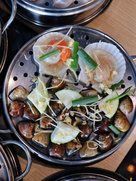 ▫️蒸氣鍋最底層放的是高湯,在蒸的過程中蒸出的湯汁也會滴入,最精華都在這一鍋啦,入口滿滿的海味、超級鮮甜,喝到我們欲罷不能!還有蛋餃、高麗菜、玉米筍、金針菇等可加入煮食增添青菜的清甜,配著海鮮交替著吃不容易膩口。