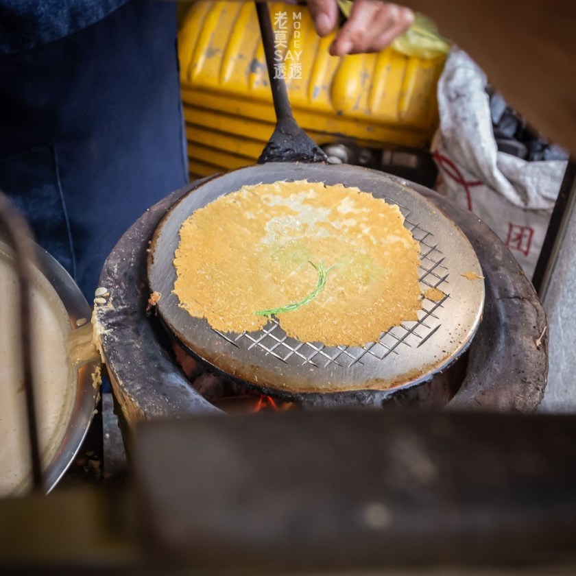 現場販售的煎餅全是由闆娘一早手工製作,翁大哥表示,煎餅的烤盤是由越南帶回,”夯爐”是嘉義民雄製作的,工藝已快失傳了。闆娘原在越南台商的煎餅工廠製作煎餅,後來將這手製作煎餅的功夫在台南開店。