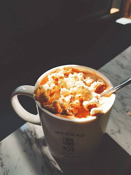 先吃掉上面的甜甜脆脆的爆米花,搭配喝一口溫拿鐵,整個身體超溫暖舒服的啦!