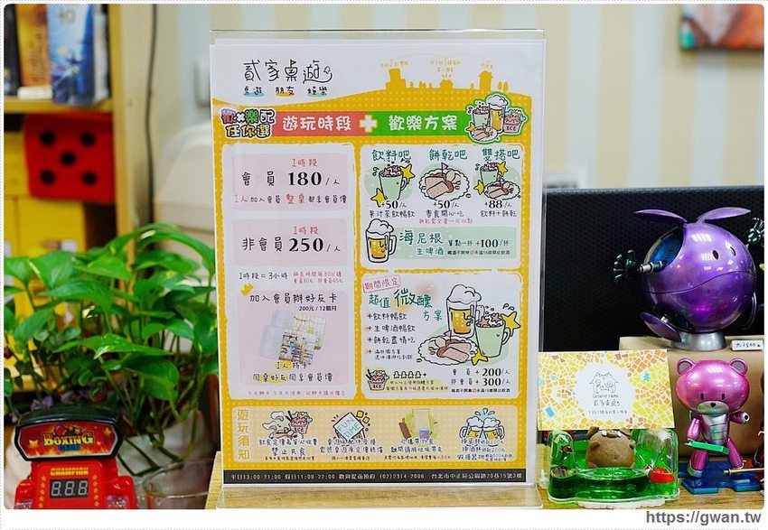 先來介紹貳家桌遊的消費方式,如果你很常來玩可以申辦會員卡,一年只要200元,現買現用!持會員卡來消費,玩三小時每人只要180元,一人會員可享整桌會員價,非會員則是250元/人,等於超過三個人來玩的話,直接辦一張會員卡最划算