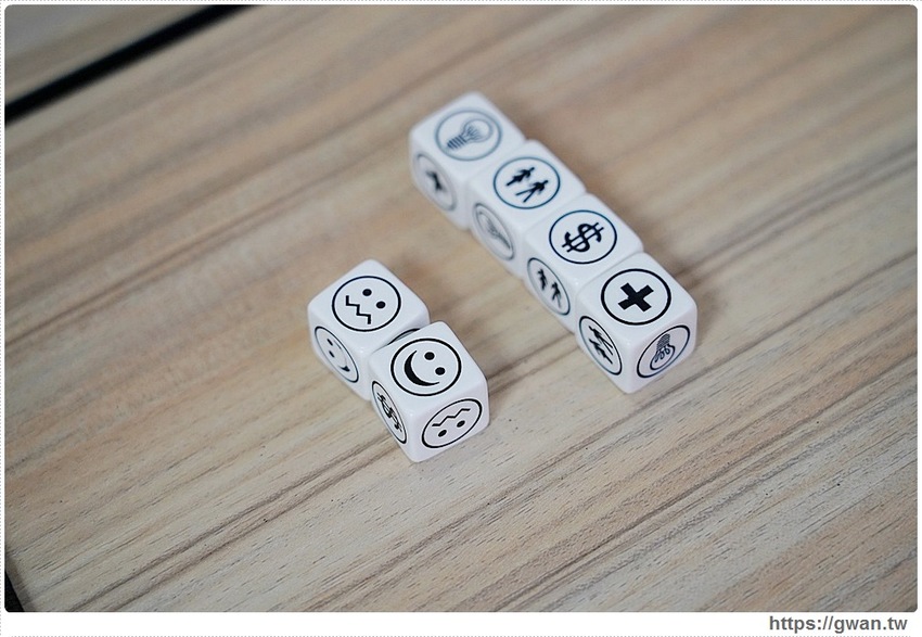 從左到右分別是知識、人際、金錢、健康,下面是壞運和好運,骰到三個好運可以挑選桌面上任一張牌,骰到三個壞運就要選一張自己的牌丟棄