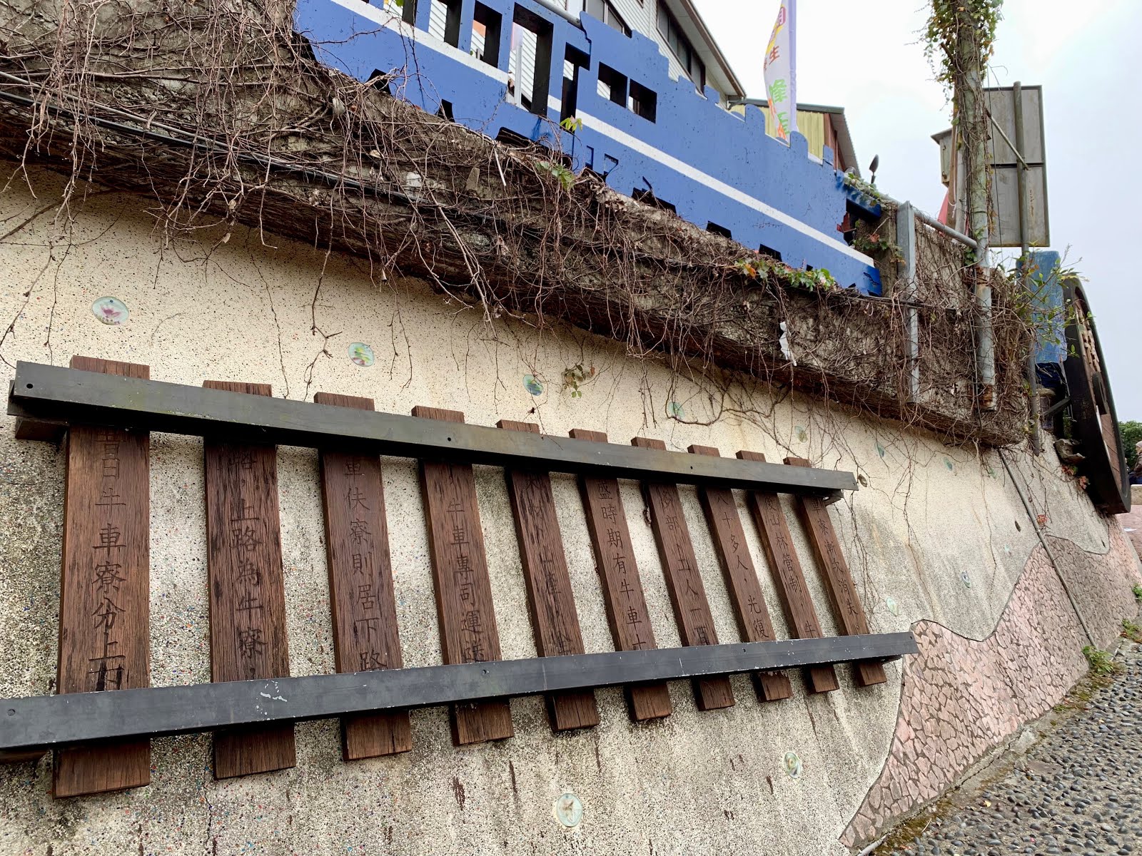 因勝興車站就在旁邊,以火車鐵軌與枕木的意象,書寫關於此地牛車寮的小故事,也非常有在地特色。上面寫著「昔日牛車寮分上下路,上路為牛寮,車伕寮則居下路,牛車專司運送木材、山產,全盛時期有牛車十多部、工人一百八十多人,光復後山林管制,牛車寮漸次消失。」