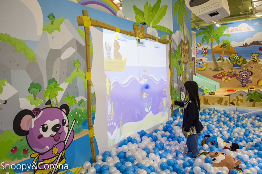 牆上是多種機關軌道的小球互動設備以及投影互動遊戲,