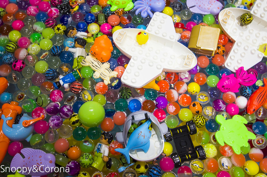 水池裡有好多好多的圓球、小魚、小烏龜…拿起撈網與水盆盡情打撈玩水吧。