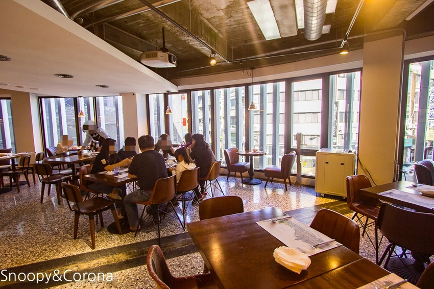 用餐區有大面採光落地窗引進陽光,還能看到車水馬龍的街景。