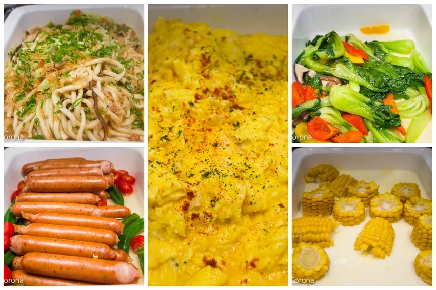 熱菜的部份提供了和風烏龍麵、奶油燉玉米、炒蛋、德式手工香腸和季節食蔬
