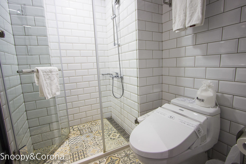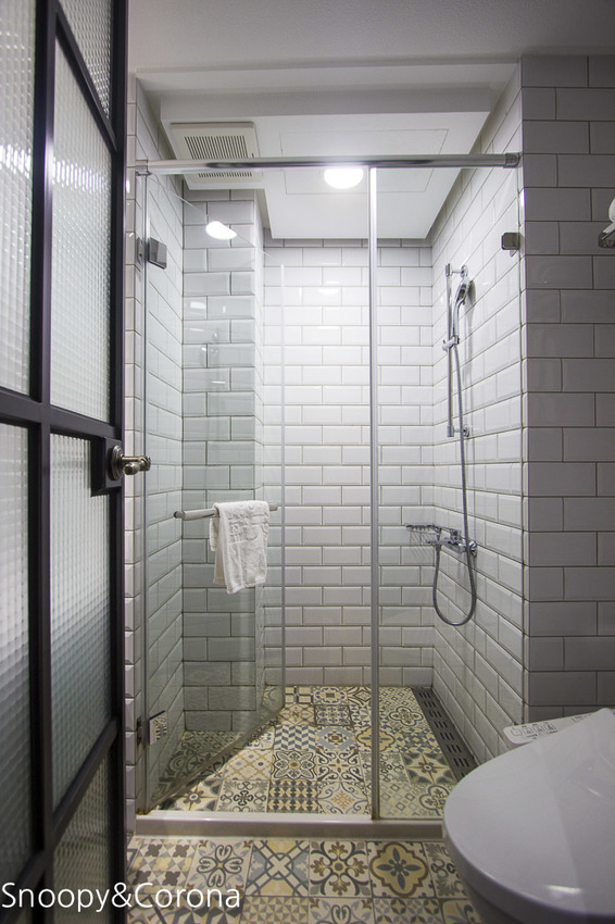 牆面是簡單的白磁磚,地板則是馬約利卡磁磚,也是呈現出復古風格。