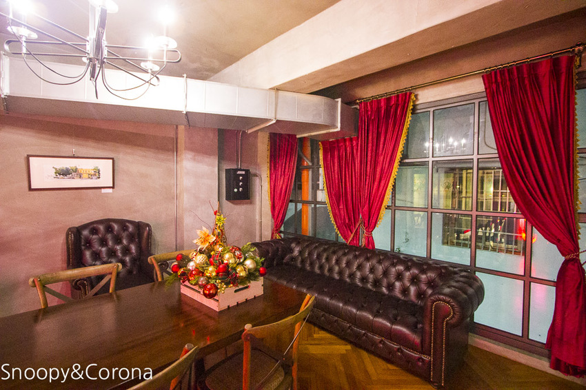 復古沙發、復古吊燈、還有刻意復古的大紅窗簾,