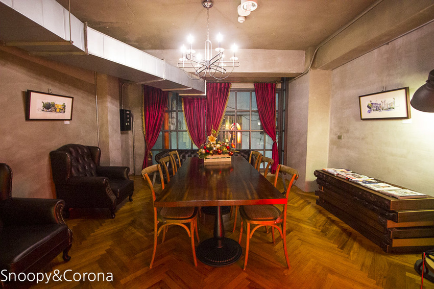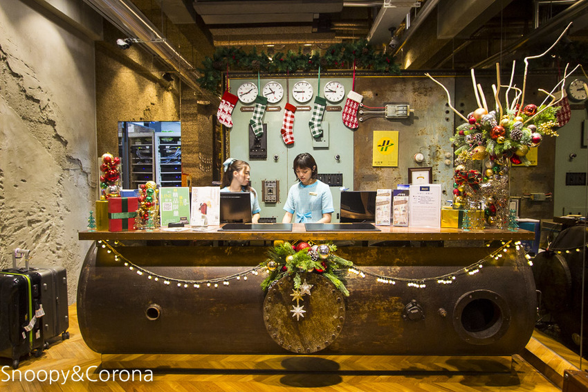 櫃台是採用燒熱水的廢棄鍋爐倒置並鋪上桌面,後方是舊式機電牆,