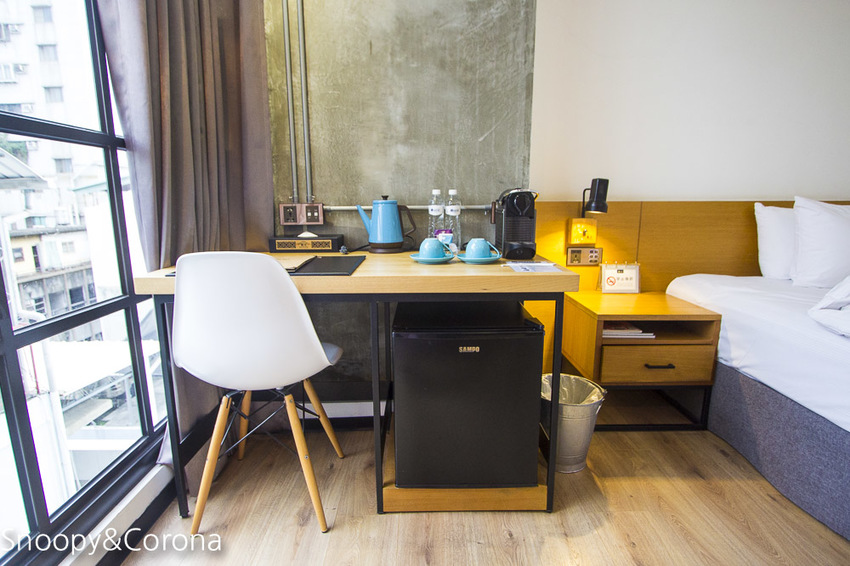 寫字桌結合mini bar,提供礦泉水、咖啡杯和煮水壺,