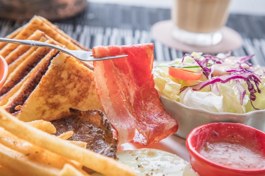 培根稍微煎香帶有焦脆感及鹹鮮肉汁,燒肉豬是用嚴選的豬梅花製作,醬香入味,肉質也很軟嫩多汁