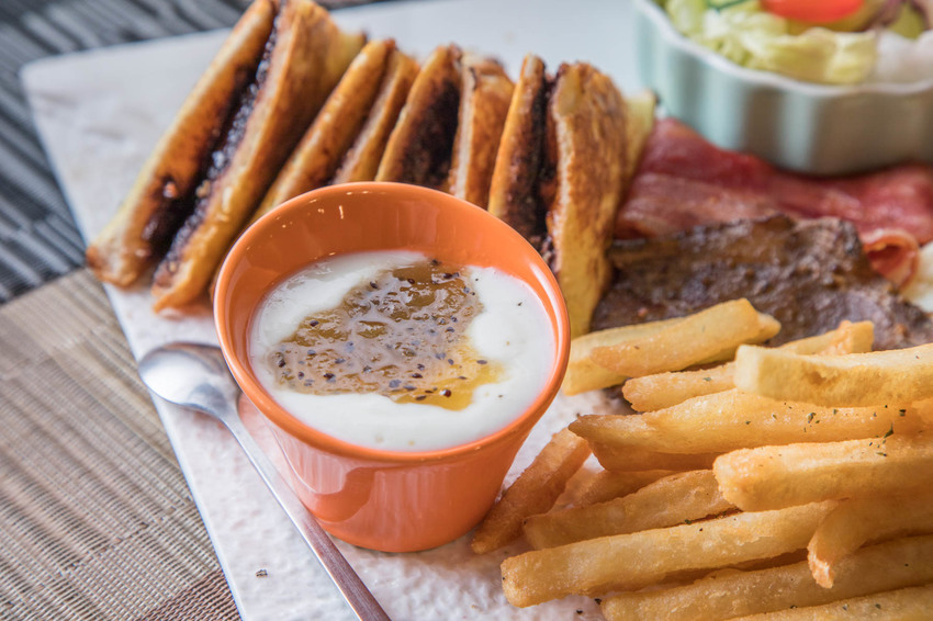 巧克力先生:法式巧克力、脆薯、沙拉、太陽蛋、燒肉豬、培根、果醬優格、地瓜泥,八種菜色超豐富