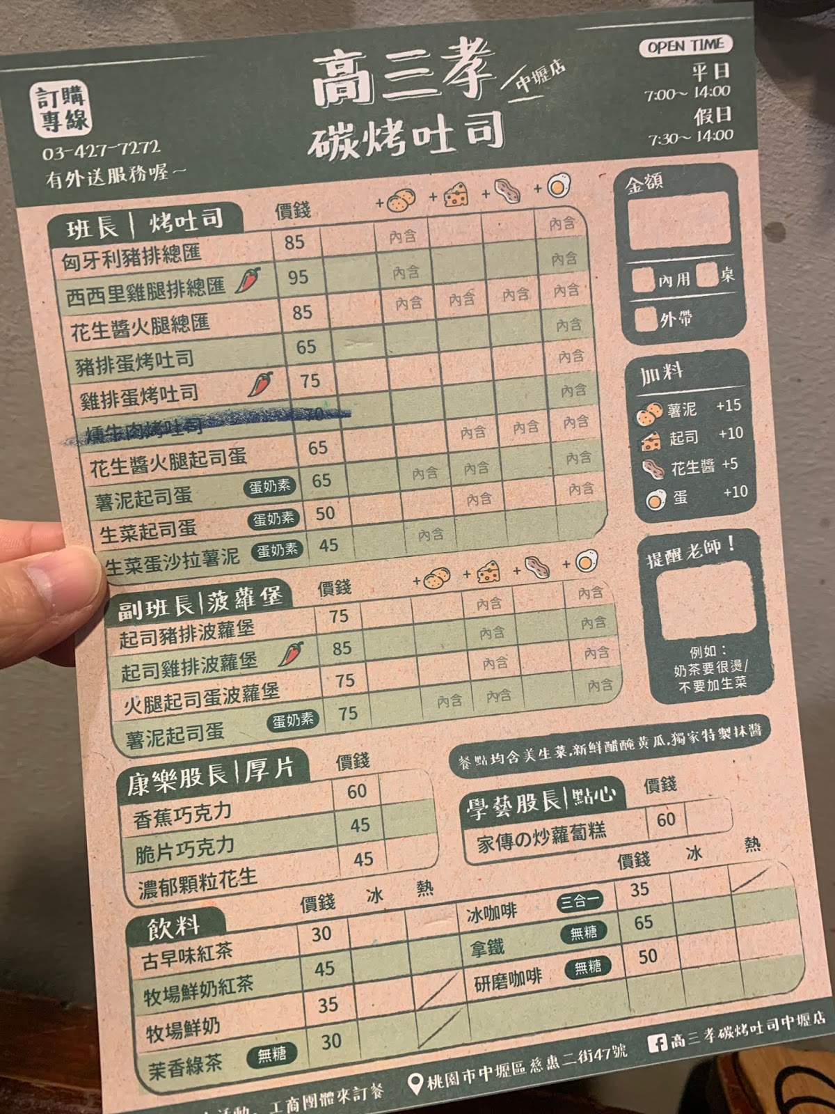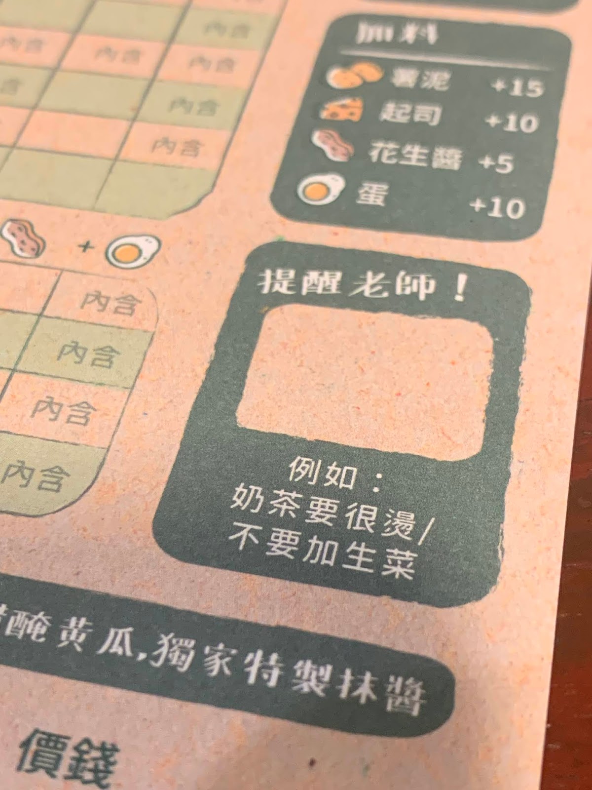 如果有特別點餐需求還有特別欄位「提醒老師」提供顧客填寫