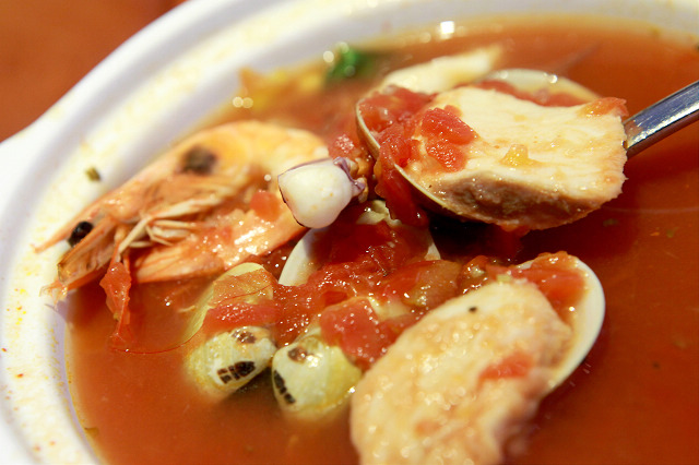 蕃茄海鮮湯,食材真是多得讓人一時之間無法回神,有魚肉、蝦子、蛤蜊與透抽等海鮮,與熬煮帶有番茄特有的茄紅素酸甜香氣的味道很搭。