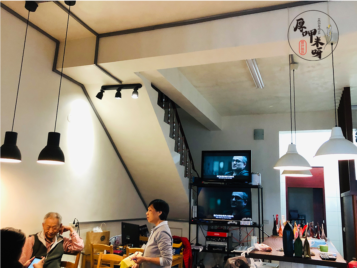 店規劃在一樓,有一半的空間囤放著大批的咖啡豆及一台烘豆機,另一半的空間則是老闆煮咖啡的空間及座位區,座位區的四周在老闆的配置下有多台電視機,今日放映電影中,老闆也有switch等遊戲可以使用。