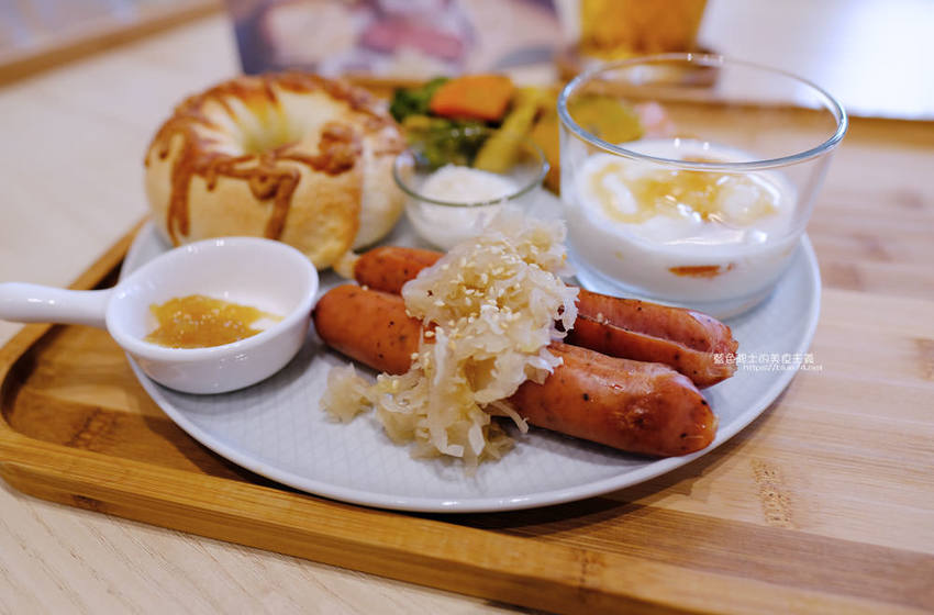 雙重起司貝果深得我心,吃起來有一點嚼勁、有彈性的,內餡起司很多,個頭滿大一個的,左邊有自製果醬,可以增添不同風味。