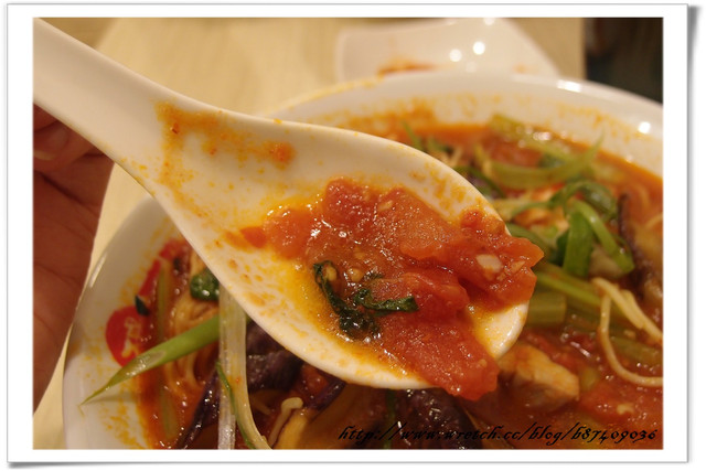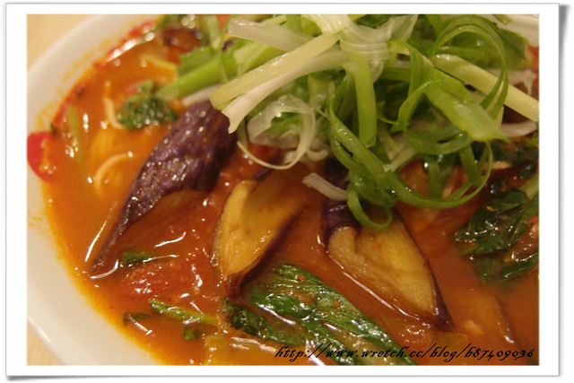 紅紅蕃茄湯裡翠綠的青菜&蔥絲還有鮮紫的茄子 配色漂亮到讓人不禁食慾大開 拍完照立刻開動