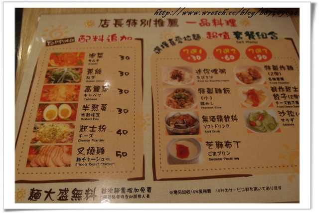 拉麵多+30/60/90元就可以配成套餐 7種附餐中組合成自己喜歡的套餐
