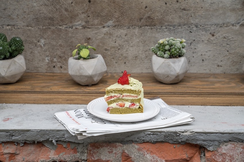 戚風蛋糕帶點淡淡抹茶香氣搭配夾層滿滿草莓,酸甜滑順不甜膩