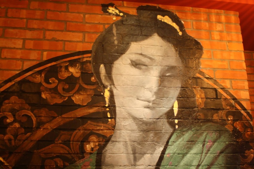 復古的紅色磚頭牆面上 , 畫著超大的彩色仕女圖