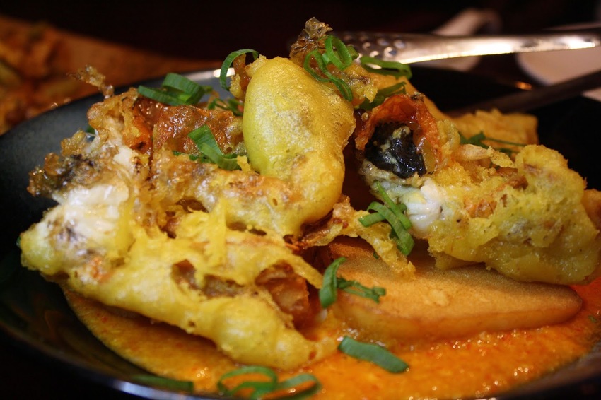 上頭軟殼蟹炸的酥脆可口 , 咬下去充滿螃蟹的香味
