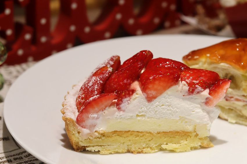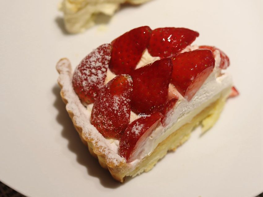 草莓季怎能錯過草莓甜點呢?這個草莓塔的側面,可以清楚看見組成成份,依序是塔皮、杏仁餡、舒芙蕾蛋糕、鮮奶油、卡士達餡及新鮮草莓。