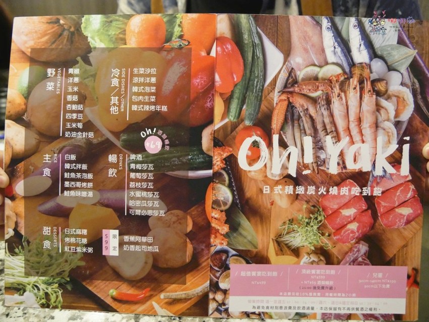 店內就分成兩種價位:499元和599元,差別在599元可以選比較多種食材,感覺也比較高級點,如果只是單純想要肉類吃到飽,選擇499元就可以了。不過我覺得就算是599元也是便宜很多,現在日式燒烤吃到飽動輒就要6、700元以上,沒有點到700元好像也吃不到什麼,這邊499元的選擇就很多了,老闆人真好。