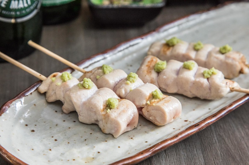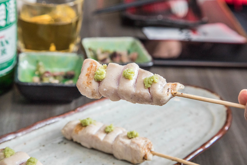 手串本舖串燒向來以使用頂級桂丁雞所聞名,採用桂丁雞的里肌肉部位,只簡單用鹽及現磨山葵來調味,桂丁雞特殊養殖法這個讓雞肉可以吃5~7分熟的嫩度,雞肉極為鮮甜多汁,用鹽及山葵調出桂丁雞的甜香感,中間半熟部位好似生魚片一般軟嫩