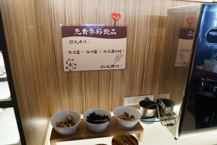 飲品的部分菜單上有四種選擇,如果不想加購飲料的話,店內有免費提供「陳皮熱茶」和「洛神花茶」可以飲用,不是什麼便宜的紅茶喝到飽,也不是喝超膩的汽水機,終於有餐廳提供不一樣的飲料了~個人推薦陳皮茶,喝起來酸甘酸甘非常開胃!