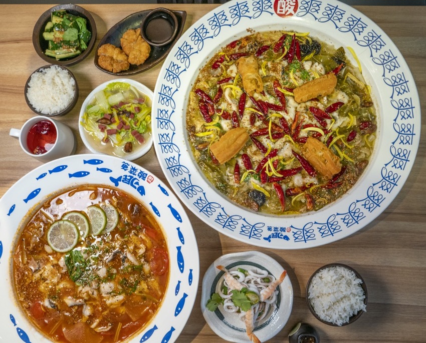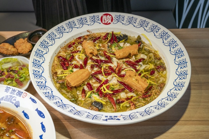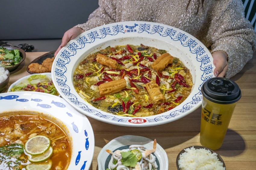 大盤子端上桌,看起來是不是特別豐盛呢!首先要介紹的是人氣招牌「秘罈酸菜魚」,特盛的超大盤子周圍寫上滿滿的「爽」字,不管是分量還是口味,吃了就是爽啊!