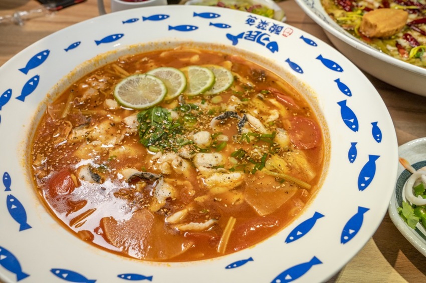大盛的盤子圖樣又不太一樣了,一整圈可愛的小魚圍繞在盤子上,「初戀番茄魚」想必也是酸V呀酸V的滋味吧,橘紅的湯頭上面用檸檬裝飾,湯匙隨便撈都能撈到熬製軟嫩的番茄,湯頭更是滿滿番茄特有的微酸滋味,和招牌酸菜魚相比,這道番茄魚口味更加溫和!