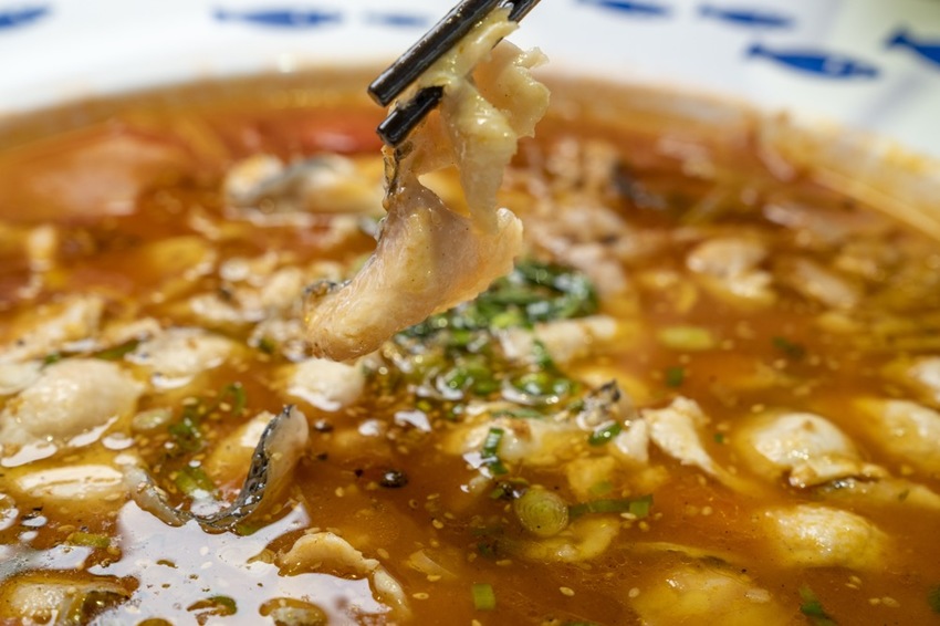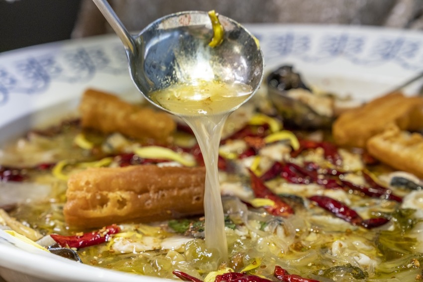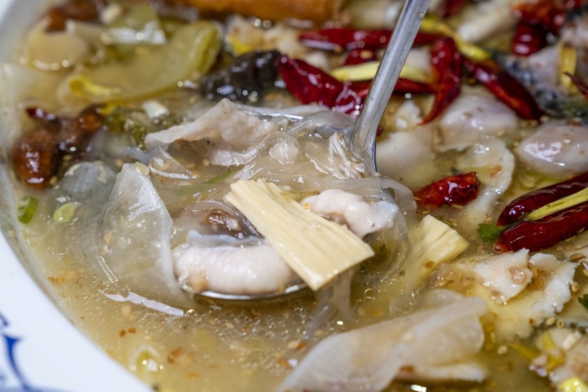 撒上滿滿的辣椒和黃菊花瓣,鮮明的色系用看的就覺得胃口大開,不只配料滿滿,看到這湯頭的色澤,酸溜酸溜的酸菜魚湯熬得非常夠味,不要想說看到這麼多辣椒,會以為這鍋酸菜魚會很辣,吃起來其實算微微麻辣,算是平易近人的那種辣度!