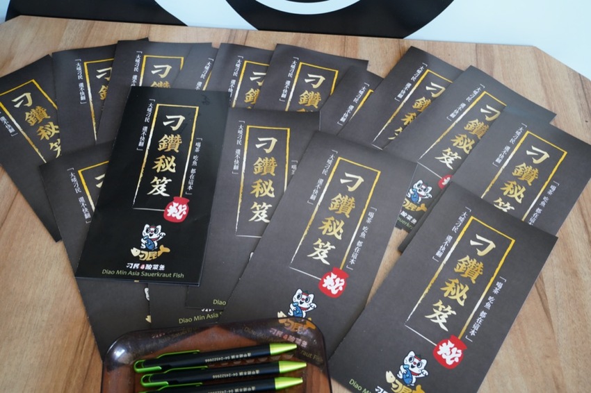 座位上的抽屜放著店內的菜單,店家也很可愛把菜單命民為「刁鑽秘笈」,餐點選擇也很簡單,主菜酸菜魚分為兩種口味,一個是「秘罈酸菜魚」,另一個是「初戀番茄魚」,依照用餐人數來選擇份量「中盛」、「大盛」、「特盛」三種尺寸。另外可以加點配料和酸菜魚一起煮,像是寬冬粉、老油條、手工丸、腐竹等等,每加一個配料須加購39元。小菜的部分有涼菜、炸物、蔬菜、滷物可以選擇。