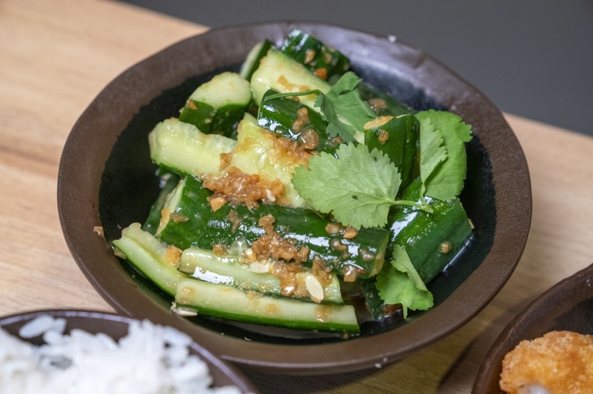 用刀子「啪」開的黃瓜淋上特製醬料,加上香菜點綴,吃起來比外面小吃店的小黃瓜更有層次!