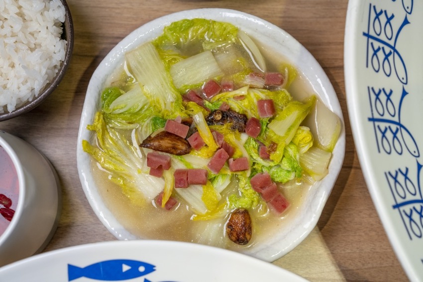 有點像是「開水白菜」,看似清淡的娃娃菜吃起來也別有風味,帶著火腿和蒜頭香氣的芡汁,讓普通的娃娃菜吃起來更有滋味,吃完大魚大肉之後,來一口這清淡的娃娃菜很可以!