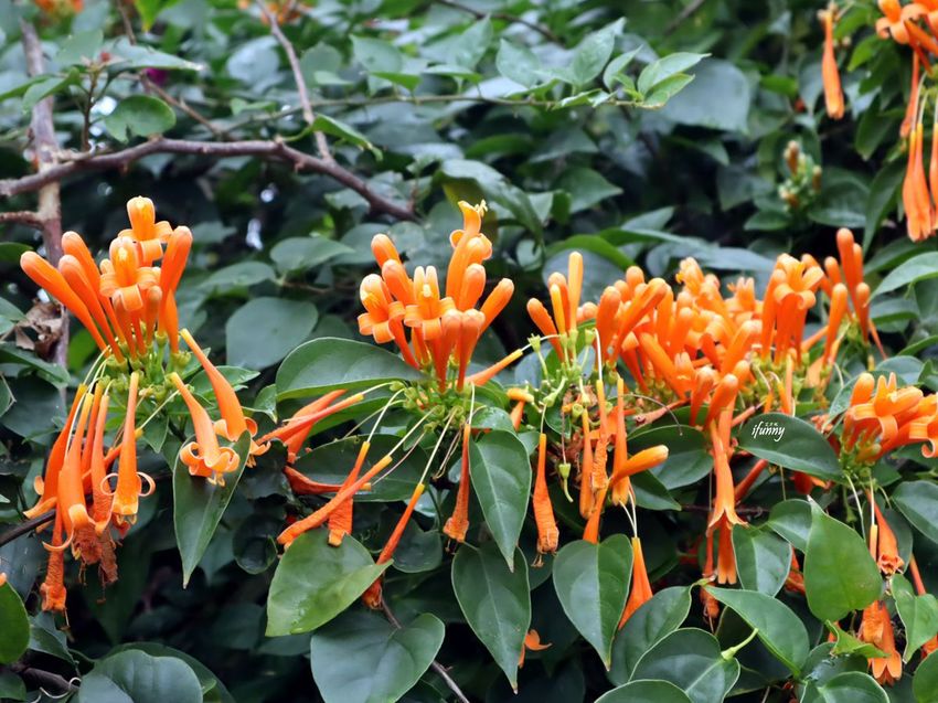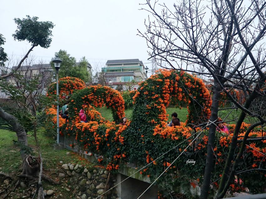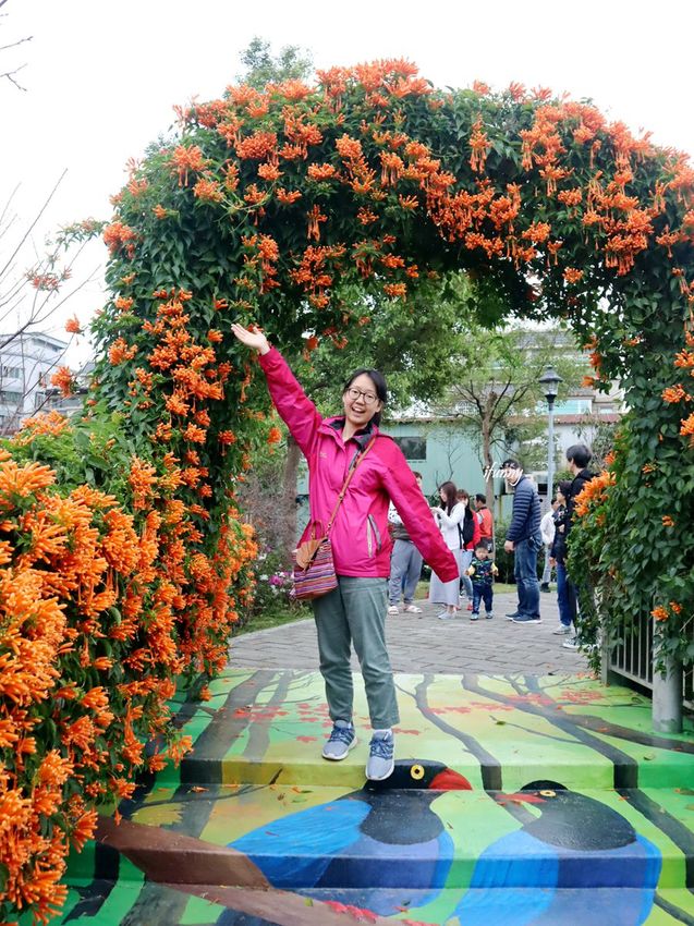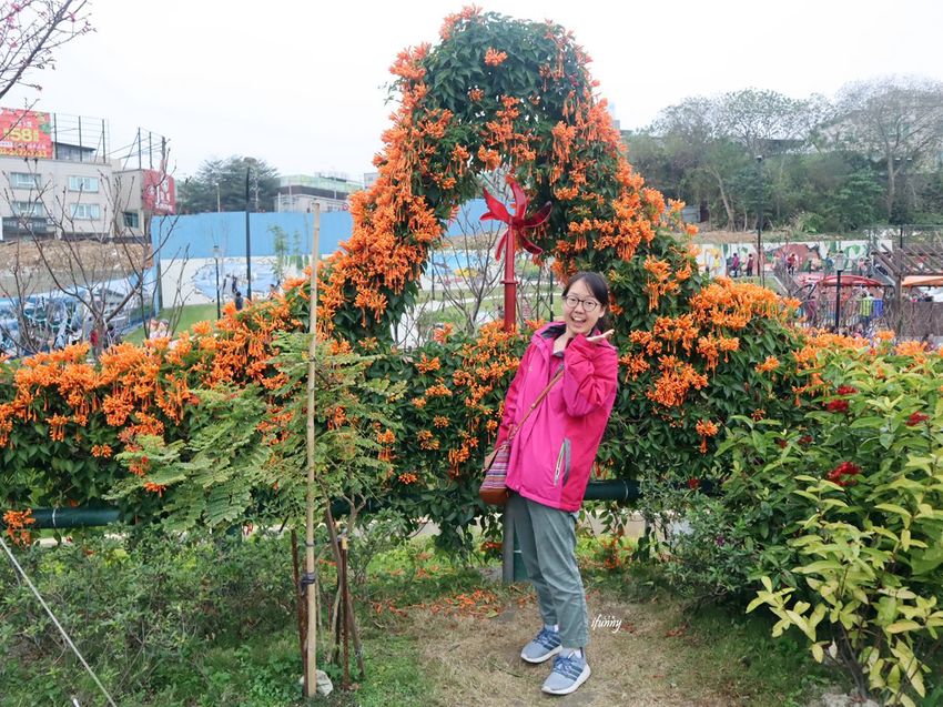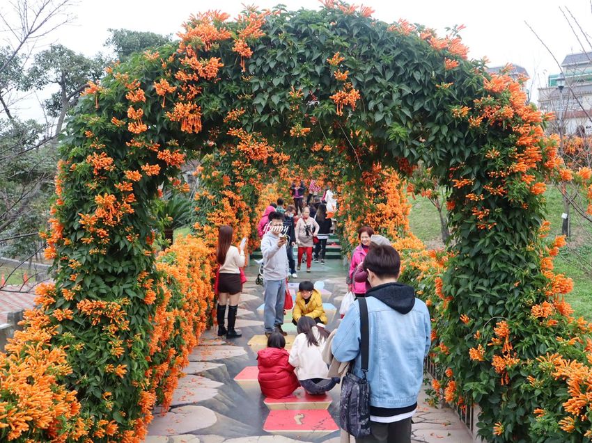 目前鶯歌永吉公園最盛開的就是炮仗花了!利用炮仗花的攀藤特性,製作出各種造景供遊客拍照。