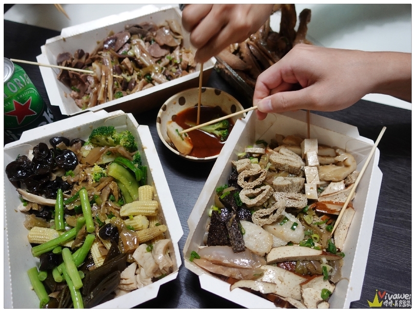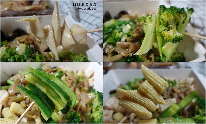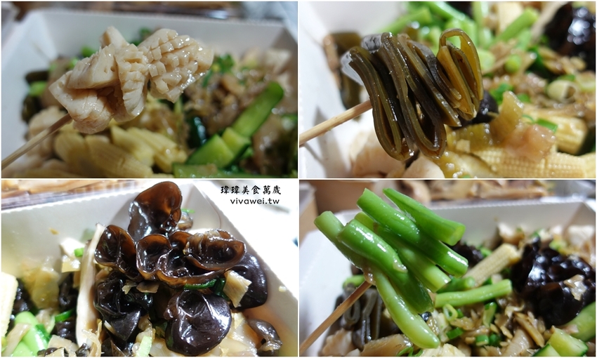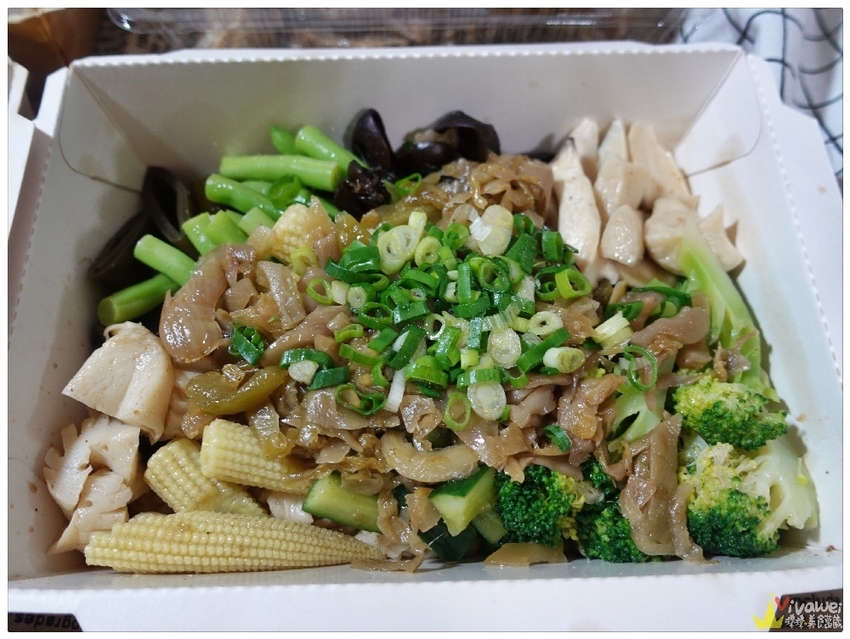 ▲拼盤裡面有杏鮑菇、花椰菜、小黃瓜、玉米筍、蒟蒻腰花、海帶、秋雲耳、四季豆等!如果想要吃得清爽,這份拼盤很值得點!怪不得老闆會說這是外送平台上最熱賣的組合啊!因為這也是最快被我們掃空的一盒!