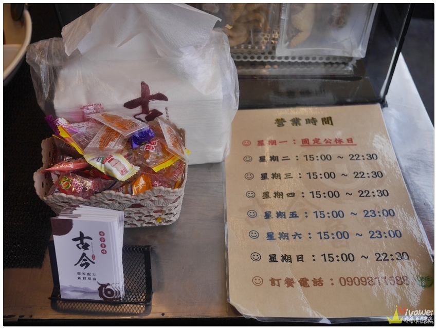 ▲桌上貼著店家的營業時間,還有附有價目表的名片可以索取,還放了些糖果可以在等待時解饞一下。