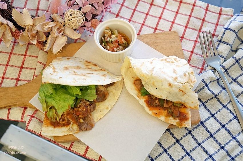 像是千層餅乾口感的脆餅裡包裹著店家自己炒的番茄牛肉,我本身不吃牛,但老闆說他們家的牛肉非常好吃,牛肉與配料都是自己搭配現炒,佐上特製莎莎醬,風味上頗有異國情調。