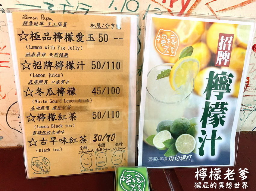菜單在這,門口的被擋住了,極品檸檬愛玉50元、招牌檸檬汁50元