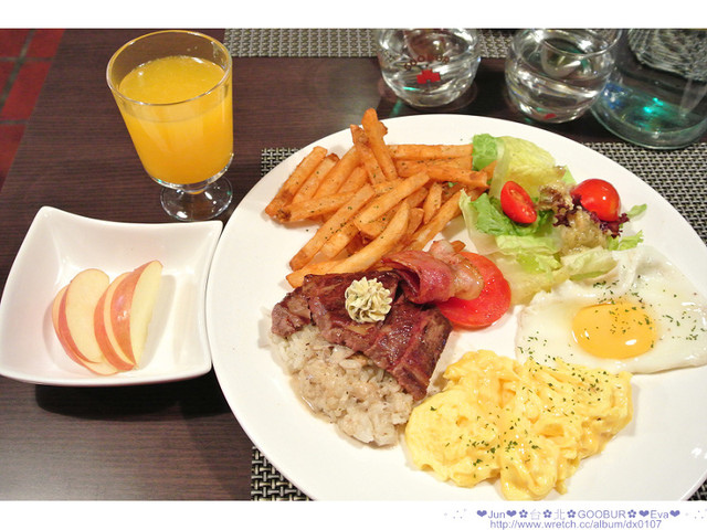 (烤牛排、烤番茄、培根、奶油風味飯、起司炒蛋、太陽蛋、水果、柳橙汁)