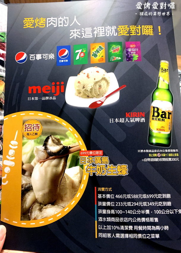 台北燒烤吃到飽-愛烤愛對囉(士林店)!全新菜單食材超優!厚切牛排、生蠔、和牛、韓式烤肉等通通吃到飽!有當月壽星優惠!