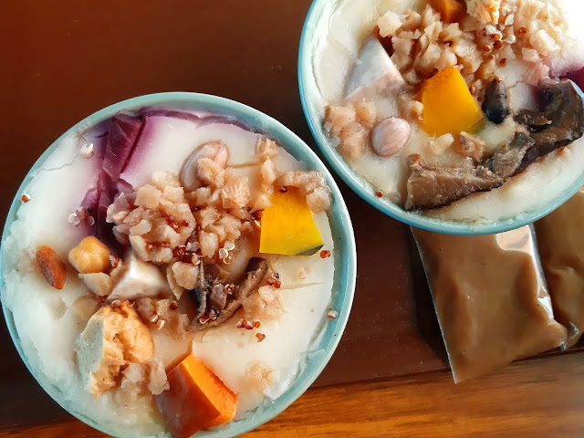 第一幸福碗粿真的跟傳統的碗粿完全不一樣,連醬料都是特調的芝麻醬口味,整體吃起來很養生,裡面滿滿食材,有豆類、南瓜、芋頭、花生、紫薯...等等等,還滿好吃的,不過我還是比較喜歡有肉的碗粿XD,但這也顛覆了我對碗粿只有一種可能的想法。