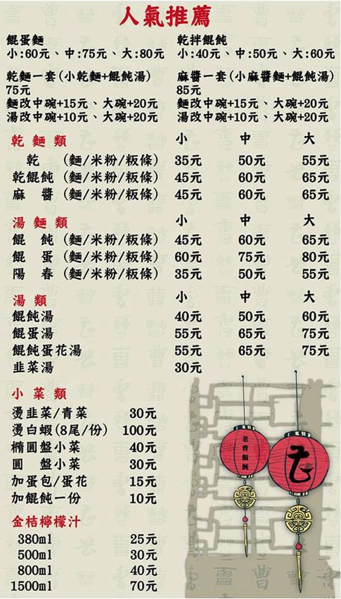 老曹餛飩的菜單,很多老客人都直接點一套(乾麵或麻醬再加湯)。