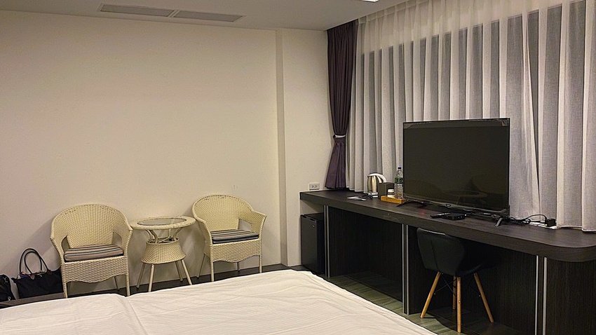 海嵐行館房型共有四種且房間數量多,今天入住的海景雙人房裝潢和設備看起來都相當新,甚至連電視最外圍的透明膠膜都還沒有撕掉。接下來講講建議的部分,房間在沒有多餘擺飾下看起來有點空蕩蕩甚至在講話時還會有回音,如果擺點有質感的掛畫或飾品應該就能夠改善。然後電視位置和床是呈現一個斜角的狀態,當想要躺在床上耍廢看電視時就會顯得有些卡卡的。不過床鋪部分是中間偏硬,然後頭枕的高度和軟硬也都適中,睡一叫起床後覺得相當舒服喔
