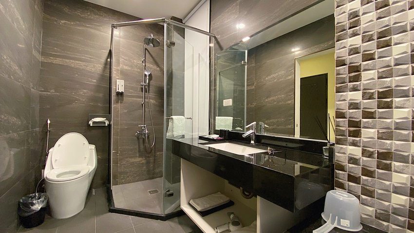 乾溼分離的浴室備品都已經放在洗手台上,然後馬桶旁有沖屁股管線可以使用,雖然不是免治馬桶但我覺得也已經夠用。窗簾拉開就是面向山的窗戶,白天可以一邊泡澡一邊欣賞山景,與陽台打開所看到的景色截然不同也是很值得一試