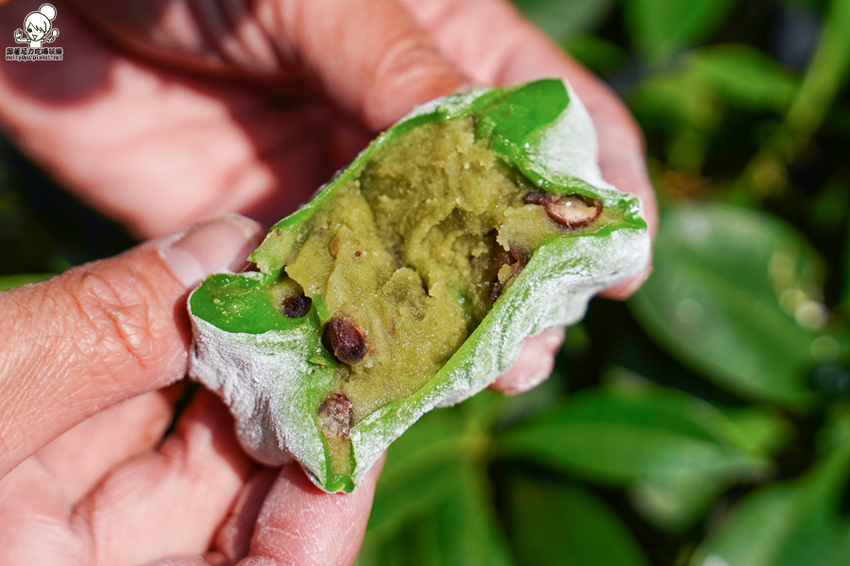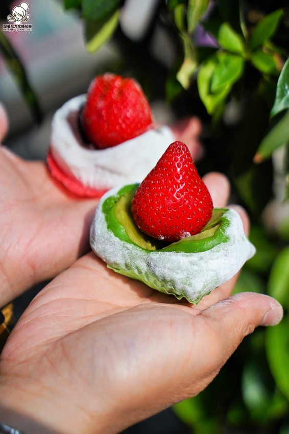 草莓青仔大福是使用抹茶麻糬,全台最大顆的青仔就在三輪車麻糬