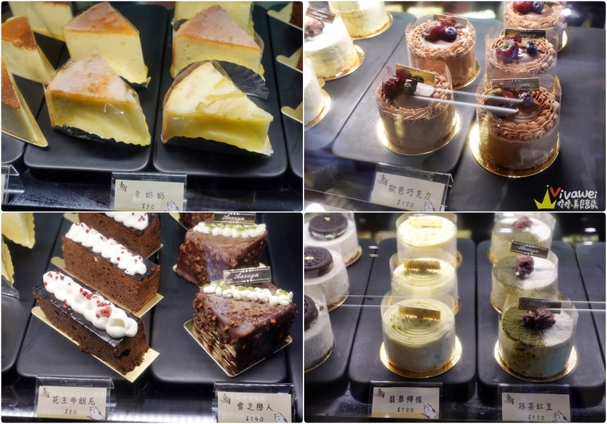 ▲老奶奶90元、歐爸巧克力120元、花生布朗尼80元、雪之戀人140元、翡翠檸檬120元、抹茶紅豆120元。