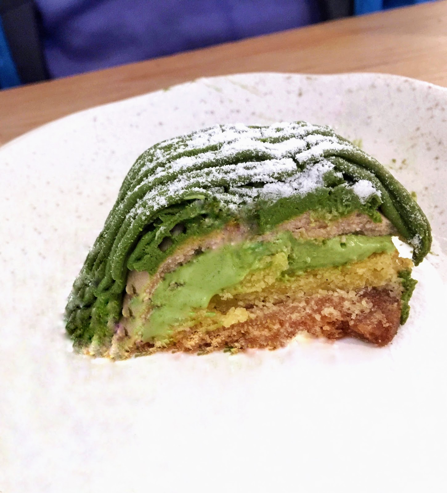 外圍綠色辮子泥是真正純苦抹茶味,裡面包覆著香甜的栗子餡,香甜的抹茶香緹奶油,還有蛋白霜、塔皮的酥甜,不同層次的甜蜜,一層搭上一層,真是好吃!