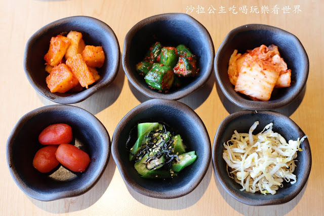 各式的泡菜、涼拌秋葵、毛豆、鹽醬高麗菜、涼拌豆芽、醃漬番茄,其中的醃漬番茄是我最愛的,以往去居酒屋或是日式料理店我都會點,吃起來酸V香甜